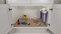 The sbvdt is your first line of defense against under sink vanity cabinet damage from minor leaks. Smaller cabinets (width or depth) width can be trimmed down to 30 ¾ or 28 The mat can easily be cut to fit any cabinet or vanity drawer. The trays tip out to reveal a hidden spot for sponges, soaps and even jewelry and watches while you're washing dishes. The sbdt prevents under sink cabinet damage from minor leaks. Rated 5 out of 5 stars. Ships from and sold by cabinetkeeper. The tray actually funnels excessive water to the front of your cabinet and out onto the floor alerting you of the leak. On the base, nonslip rubberized feet prevent shifting. Can be used in either kitchen or bathroom applications. The slide n' fit sink & vanity base protector™ is manufactured out of styrene making it both flexible and extremely durable while also mold resistant. The unique design not only protects the bottom of your cabinet by holding water, the tray actually funnels excessive water to the front of your cabinet and out onto the floor alerting you of the leak. Cabinet keeper under sink leak protection and organization tray.